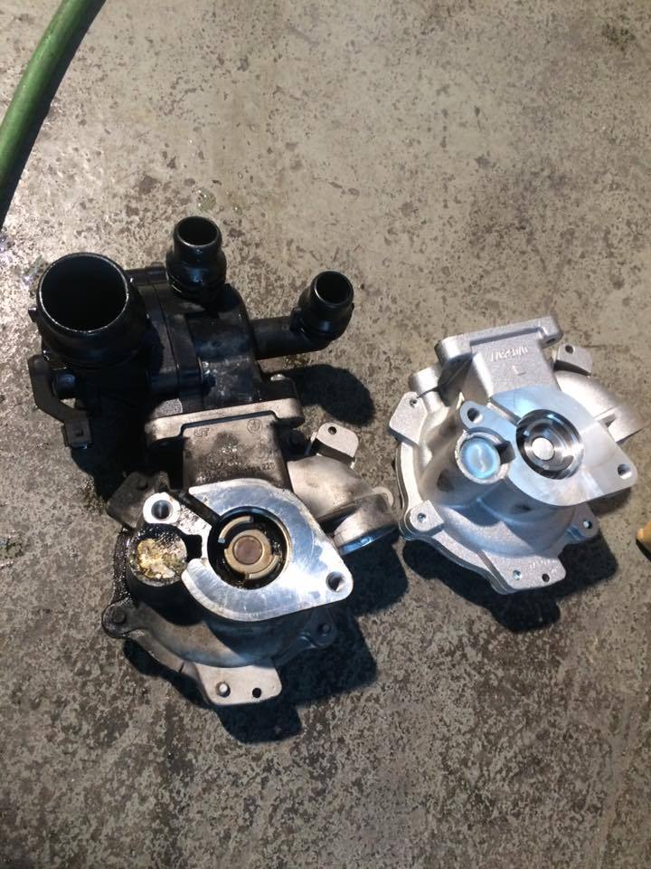 BMW318(E46)のクーラント漏れの修理です。 アッパーホース、バイパスホースのカシ目部分からと、ウォーターポンプの軸から漏れがありました。